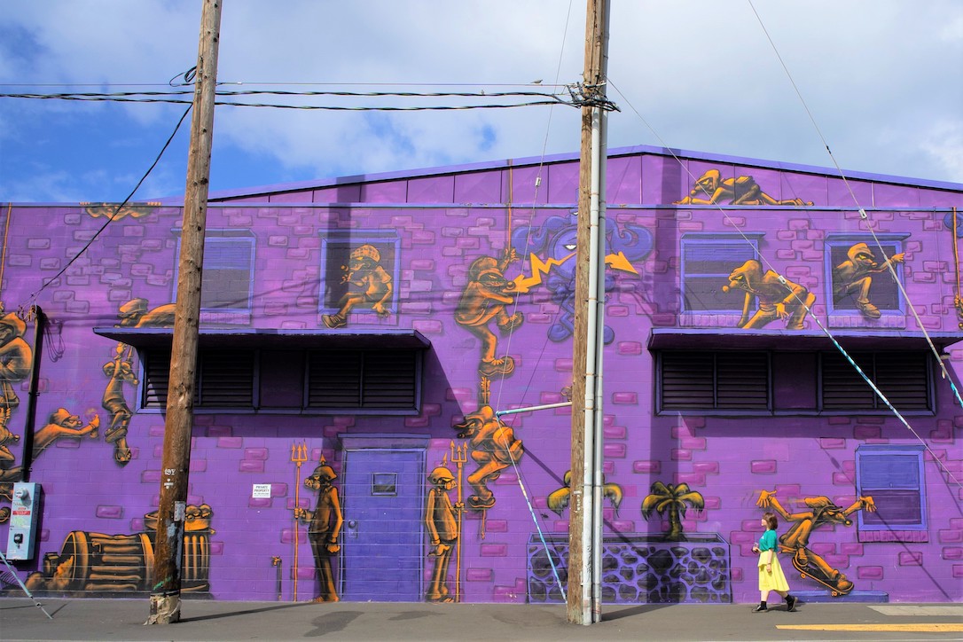 倉庫の壁いっぱいに描かれたインパクト抜群な紫のアート「Katch 1 Wall(2017)」はフィッシャー・ハワイのひとつ隣のブロックにあります。