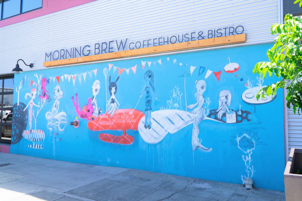 カイルアで人気なカフェの2号店「モーニング・ブリュー」は、キレイなブルーとキャッチーなイラストがかわいい「Hanapepe by Kelly Tunstall(2018)」の壁画でお出迎えしてくれます。
