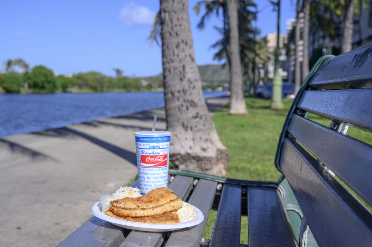 老舗プレートランチ店「レインボー・ドライブイン」でランチをテイクアウトしたら、10分ほど歩いてアラワイ運河沿いのベンチを探してみましょう。意外と静かでのんびり食事ができます。写真のマヒプレ―ト($9.95)は揚げたてのマヒ(白身魚)とマカロニのボリューミーなプレート。