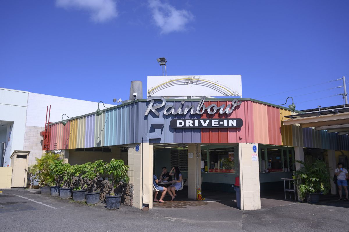 「レインボー・ドライブイン」の名の通り、レインボーの屋根が目印になっています。カラフルでかわいい外観も忘れずにチェック!