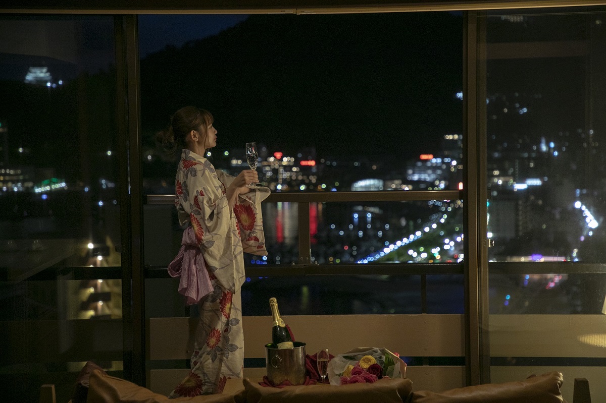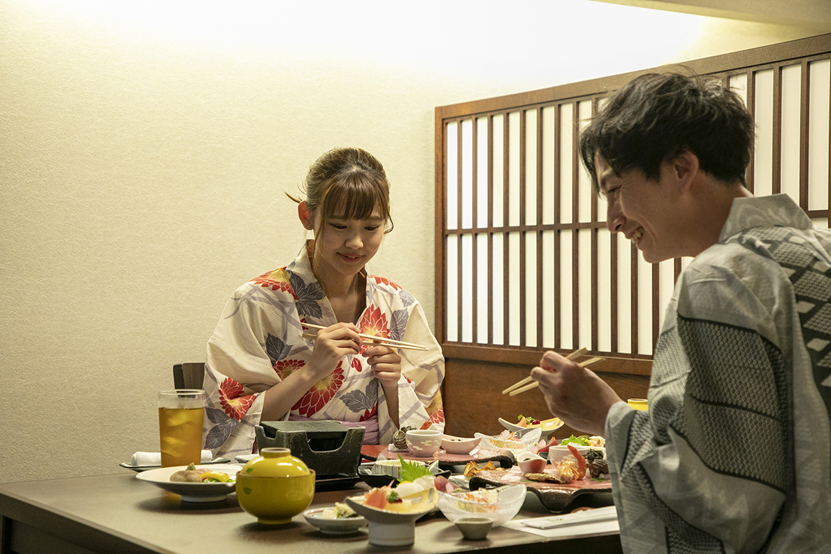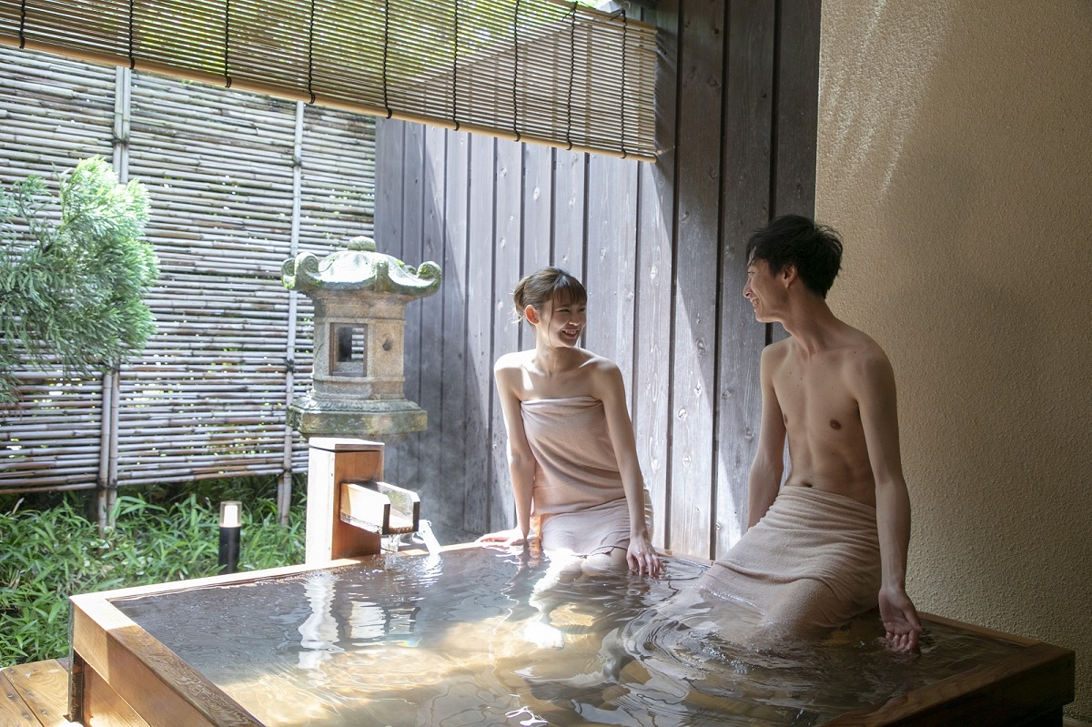 「無料貸切露天&個室食でふたりだけの温泉デート」プランなら、貸切露天風呂が50分間無料。また、女性には、おしゃれな浴衣も用意されていますよ。