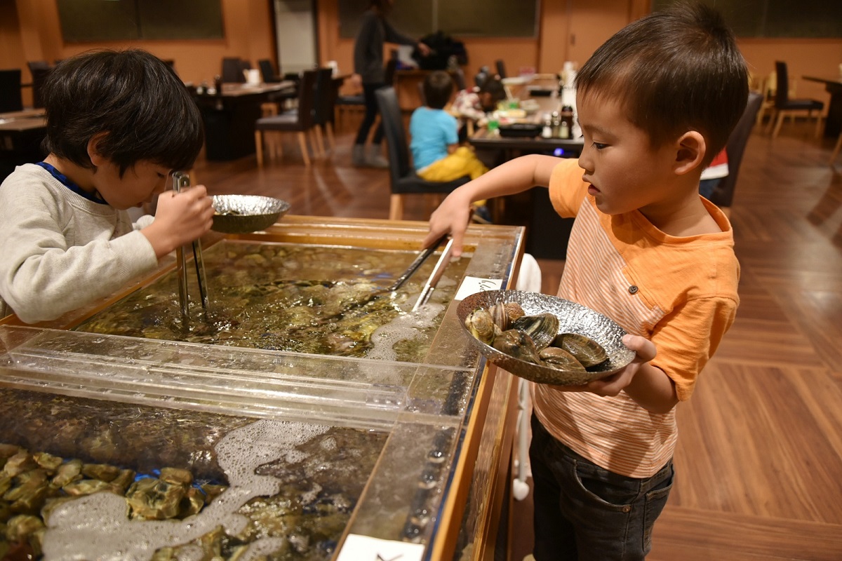 食事には、伊豆名物、金目鯛の刺身・煮付けを必ず出すことにしているそうです。また水槽から生きたままの貝を採り、自らグリルで焼き上げる体験もできます。子供が取りやすい高さで、自らチャレンジできるのも嬉しいですね。