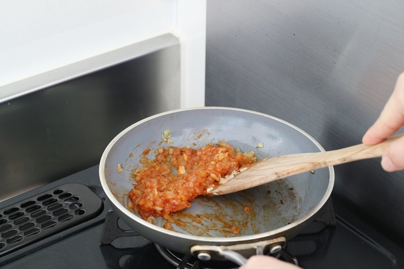 オリーブオイル、みじん切りにしたにんにくと玉ねぎをフライパンで炒め、玉ねぎがしんなりしたらケチャップを加えて混ぜます。