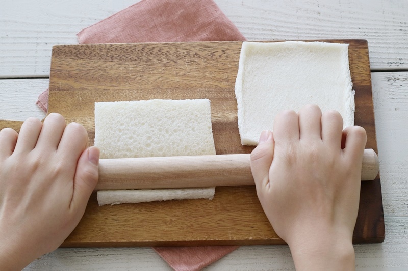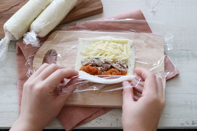 ラップの上にパンを置いて端から巻いていき、ラップの両端をひねって留めたら冷蔵庫で10分以上冷やします。
