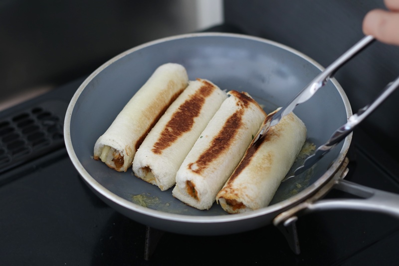 はじめはパンの巻き終わり部分を下にしてフライパンで焼いていきます。その後、ひっくり返して全面に焼き色が付いたら、蓋をしてチーズが完全にとけるくらいまで蒸し焼きにして完成です。