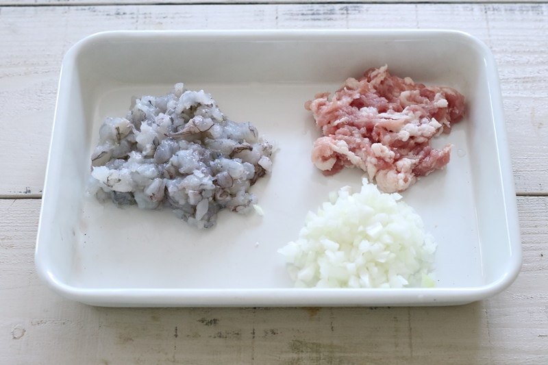 えびは殻を剥き、背ワタを取ったら水気を拭いて包丁でたたきます。豚肉も同様にたたいておきます。玉ねぎはみじん切りに。