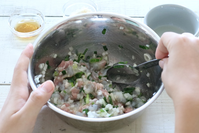 ①をボウルに入れ、小口切りしたネギ、卵白、ナンプラー、砂糖を加えて混ぜます。塩コショウをふって味を調えます。
