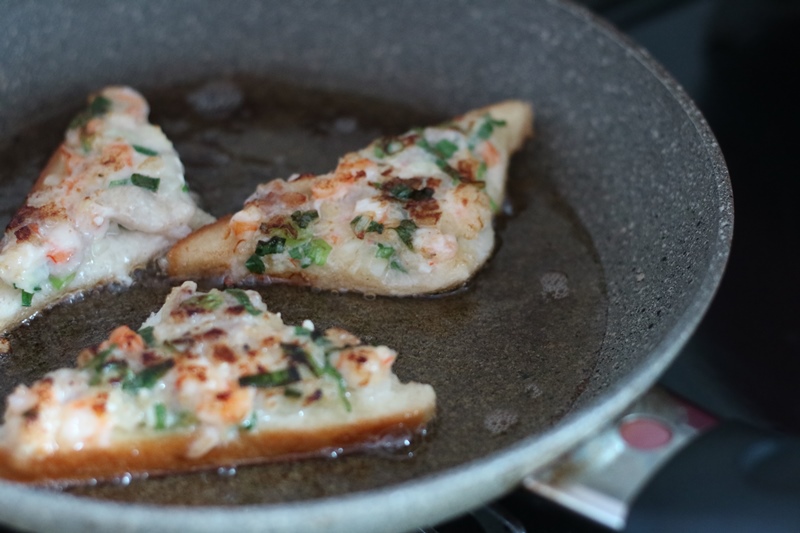 フライパンに少量の揚げ油を引き、ペーストが付いた面から低温でじっくりと揚げ焼きにします。ひっくり返して両面が焼けたら完成です。