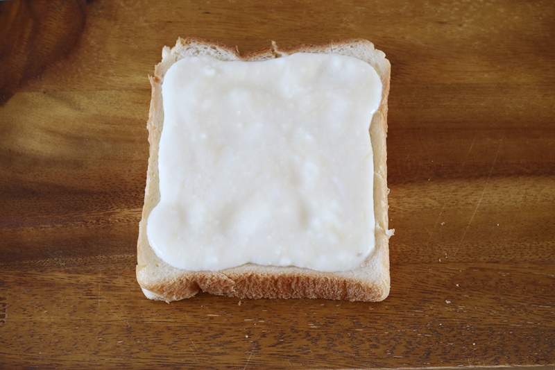 食パンを対角線上に4等分にカットしたら、表面に②のペーストをのせます。