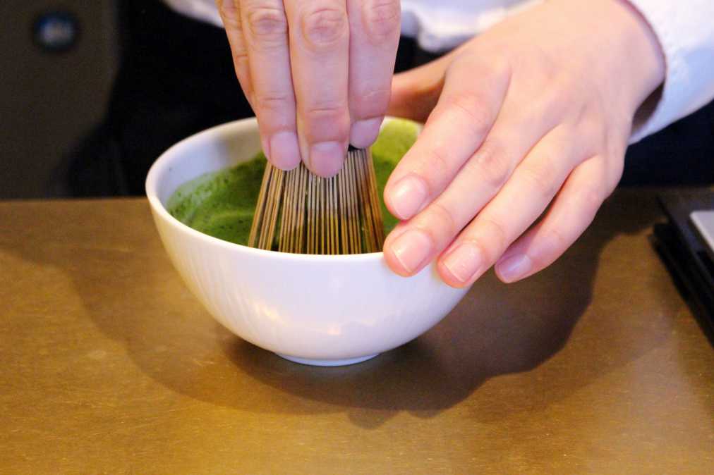 一杯ごとに茶葉の粉末を茶せんで点ててからミルクを注ぎ、最後に抹茶パウダーを振りかけて提供してくれます。