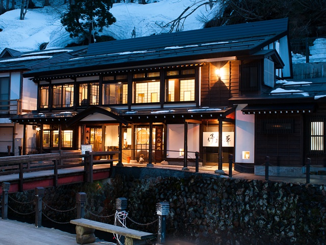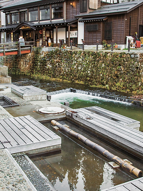 「しろがね湯」は、日帰り湯が楽しめる共同浴場。こぢんまりとした三角形の建物は、建築家・隈研吾氏が設計したというモダンな造りが特徴です。源泉掛け流しの湯には細かな湯の花が浮かび、つるりとした肌ざわり。まずはのんびり体を癒してから、温泉街散策へと繰り出しましょう。