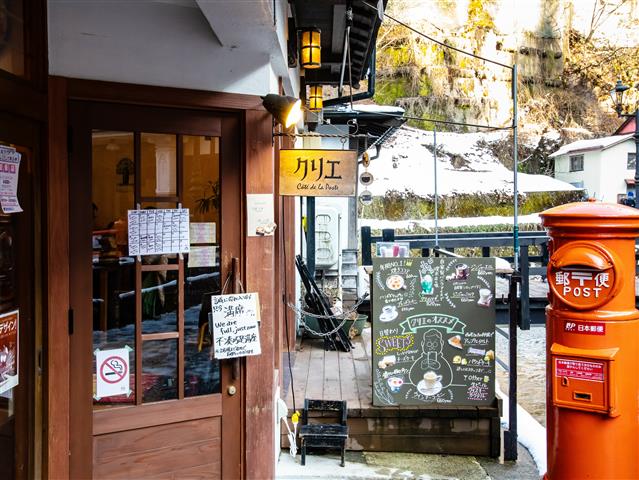 散策途中にひと休みするなら、昔ながらの丸ポストが目印の「酒茶房クリエ」へ。外観も店内もアンティーク調のエッセンスが散りばめられたおしゃれなカフェです。おすすめは、自家製ココアに焼きマシュマロを乗せた焼きココアと、シフォンケーキやロールケーキなどの自家製スイーツ。アルコール類も充実しているので、贅沢な昼飲みも楽しめます。テーブルは、できるだけ2階席をゲットしましょう。向かいの木造旅館や、温泉街を行き来する人の姿を眺めながらのんびりしたひとときを過ごせますよ。