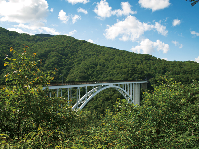 霧降高原のフォトスポットのひとつが、渓谷に架かる「六方沢橋」。橋の上から一望できる山並みや栗山ダム、遠く筑波山などの絶景はもちろん、周辺から見る橋そのものの景観も見どころのひとつです。春から夏にかけては美しい緑、秋には紅葉と、季節によって違った景色が楽しめます。橋の両端には駐車場があるので、車を停めて辺りを散策できます。