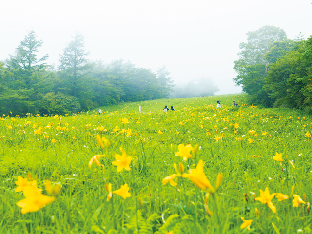 ニッコウキスゲは、6月下旬から7月中旬という短い間だけ楽しめる黄色い花。霧降高原では、小丸山の麓から山頂にかけて、このニッコウキスゲの群生を見ることができます。一面を彩る鮮やかな黄色は可憐で爽やか。麓のレストハウスから山頂の展望台までは、散策路のほかに、1445段の天空回廊(階段)が延びているので、この回廊を進みながら花の絶景を観賞するのがおすすめです。