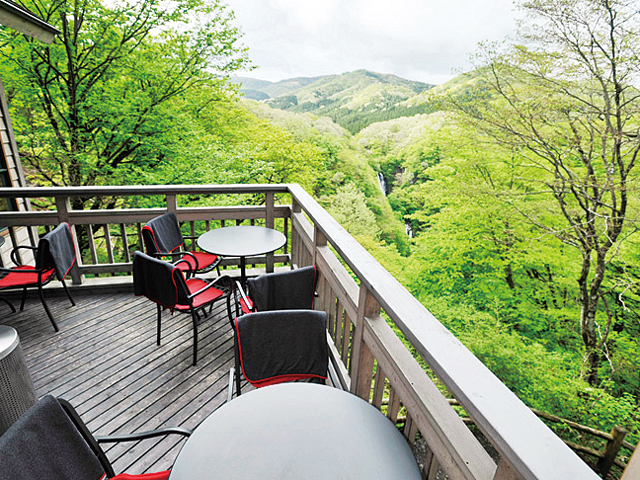 「山のレストラン」は、霧降の豊かな自然に囲まれたカフェレストラン。四方がテラス席になっているので、霧降の滝や日光連山などの景観が楽しめる眺望もあわせて楽しみたいところ。料理は、グリルを中心にした北米スタイル。海と山の幸をふんだんに使ったオードブルにあわせて、魚のグリルやパスタ、ステーキなど、ボリュームたっぷりのメイン料理を堪能しましょう。デザートに名物のチーズケーキをいただけば完璧です。
