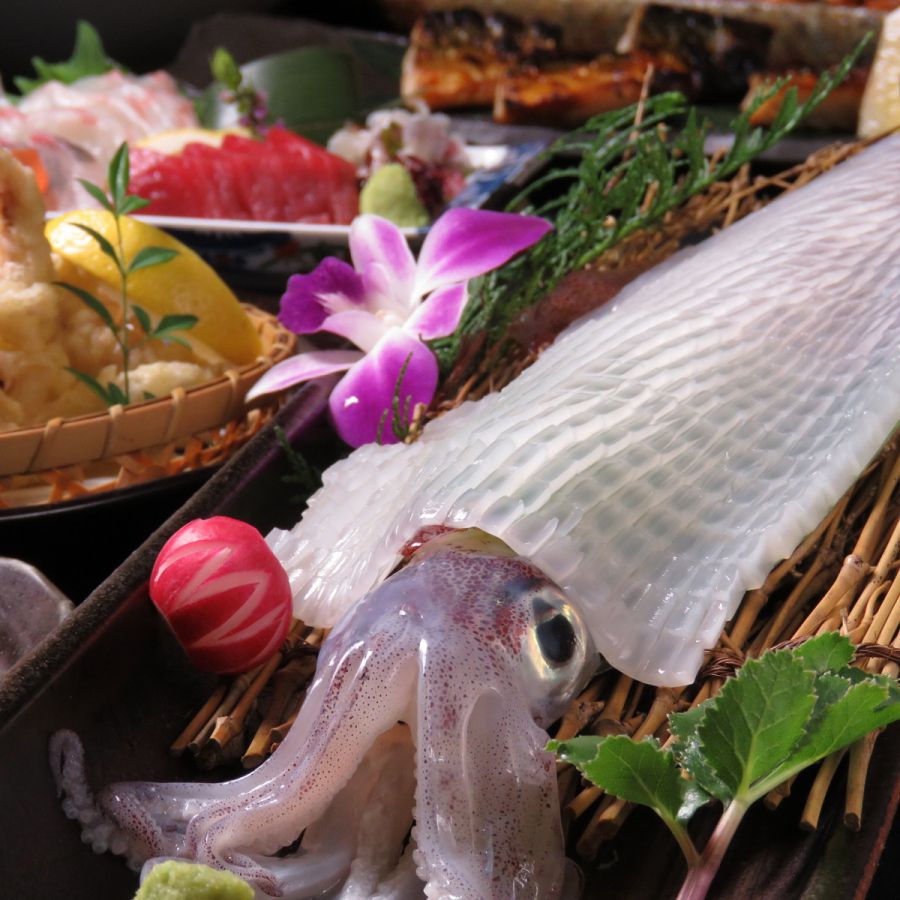 博多といったら玄界灘の海の幸。こちらは呼子から毎日直送される活イカの活き造り(1980円~。税抜)。コリコリした食感と甘さを堪能してみて。他にも鯛や鯵などが生簀に泳いでいて、ピチピチの状態から、料理長が匠の技で綺麗なお造りにしてくれます。