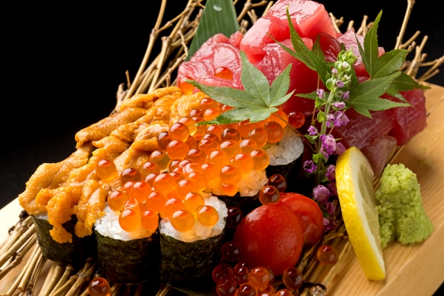豪快に盛り付けられたマグロに、雲丹やイクラがこぼれ落ちるほどにのっかっています。海苔巻きとの相性も抜群。お酒もすすみそうですね。(2人前910円/3人前1370円/4人前1820円。すべて税抜)