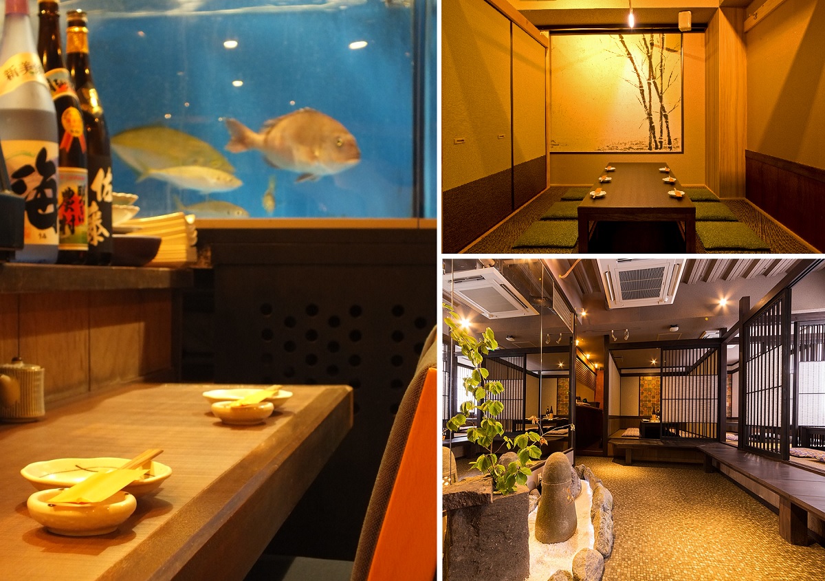 店内は大小様々な個室や掘りごたつ席などが揃っていて、同じビル内には、少し上質な空間として「離れ」も用意されています。親しい人と一緒に楽しんだり、カウンターで料理長の手さばきを見ながら、じっくり料理を堪能するのもその日の気分で選べますね。