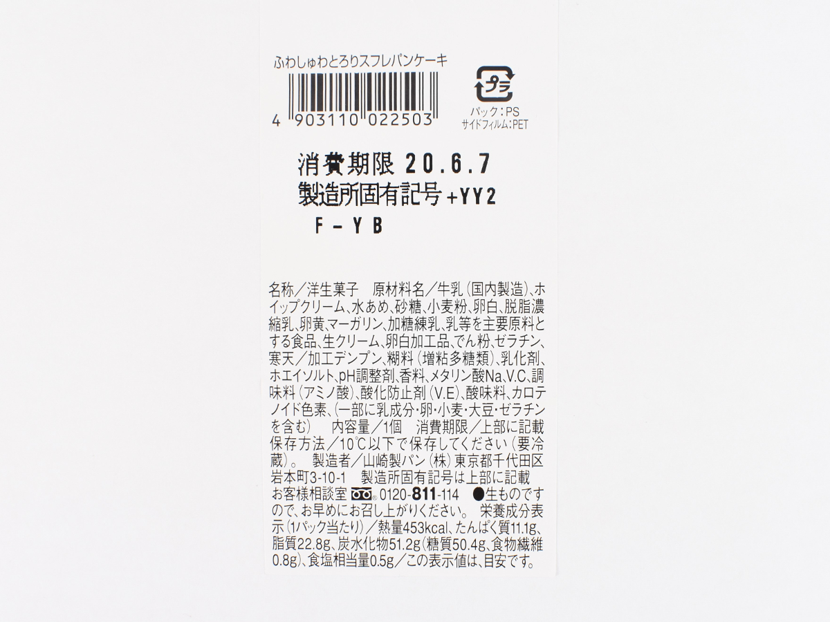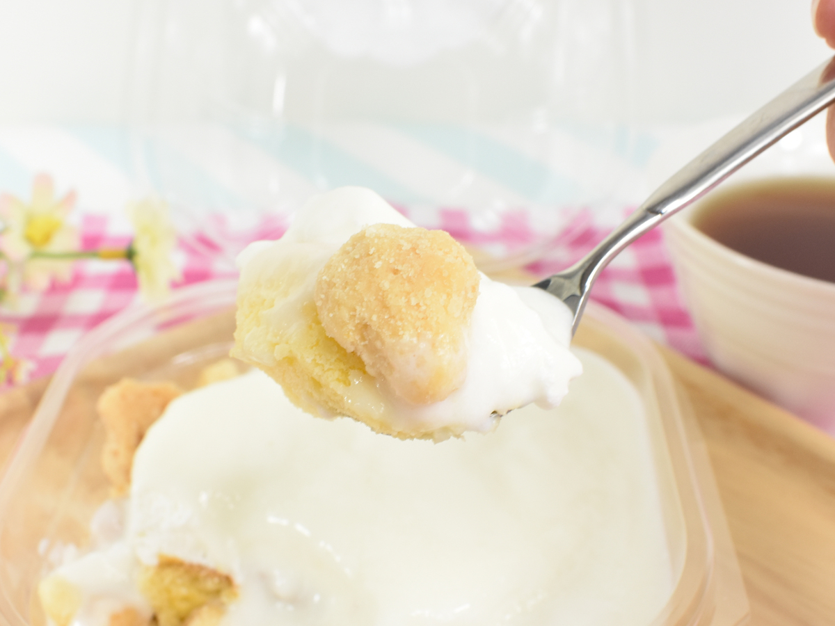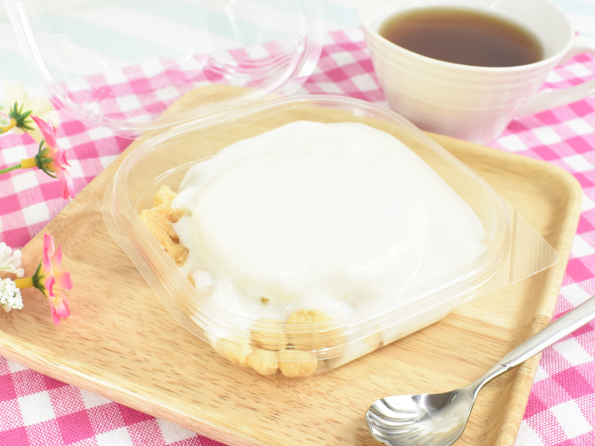 四角いパッケージに入っているスフレパンケーキ。一番下にはクランブルが敷き詰められており、何ともキュートですね。ちなみに、1パック当たりのカロリーは453kcal。かなりボリューミーな見た目なので、カロリーは少しだけお高めですね。