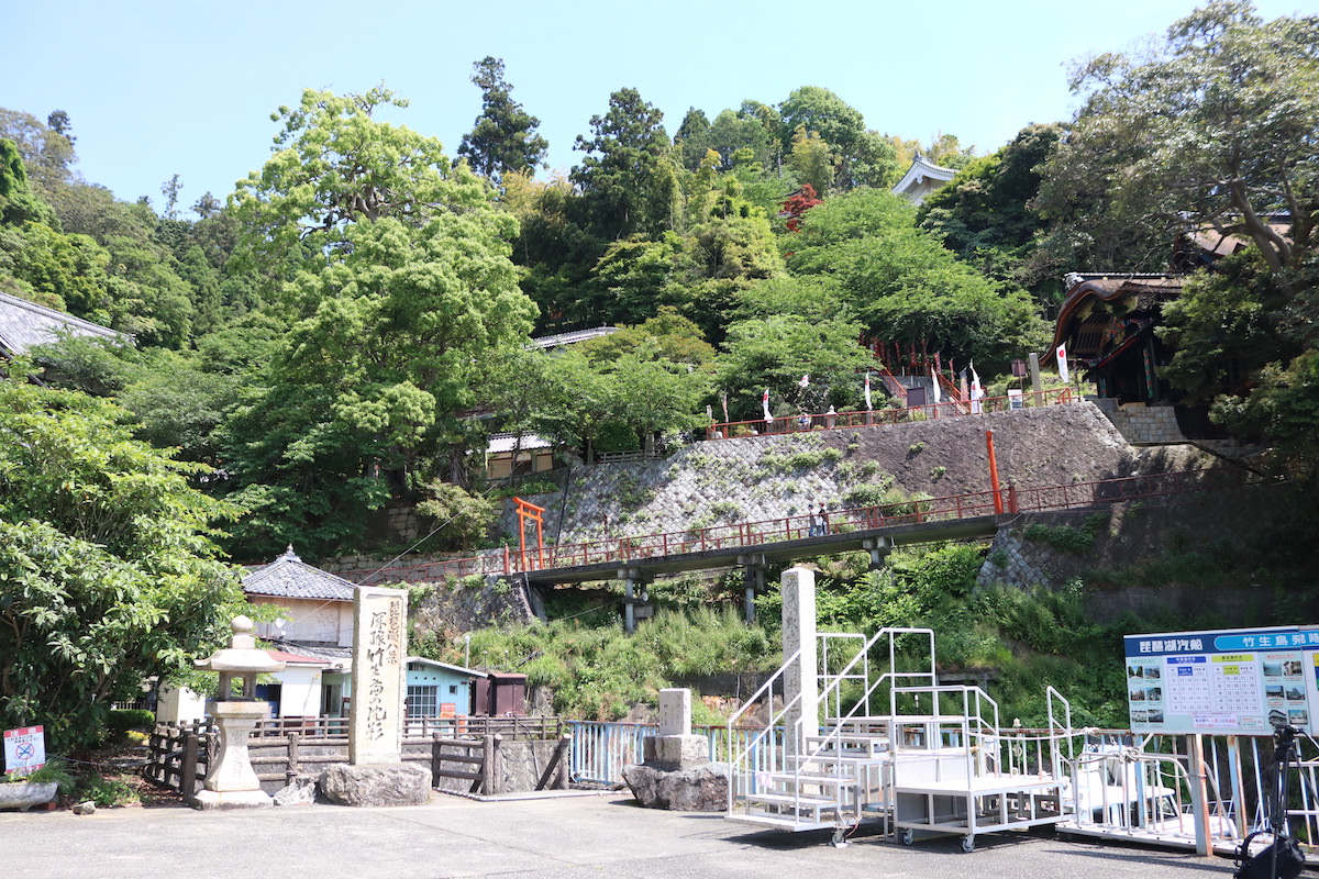 船着場に到着したら、いよいよ竹生島へ上陸。緑いっぱいの山の間からは宝厳寺や都久夫須麻神社の屋根がちらりと見え、早くも神聖な気持ちに。
