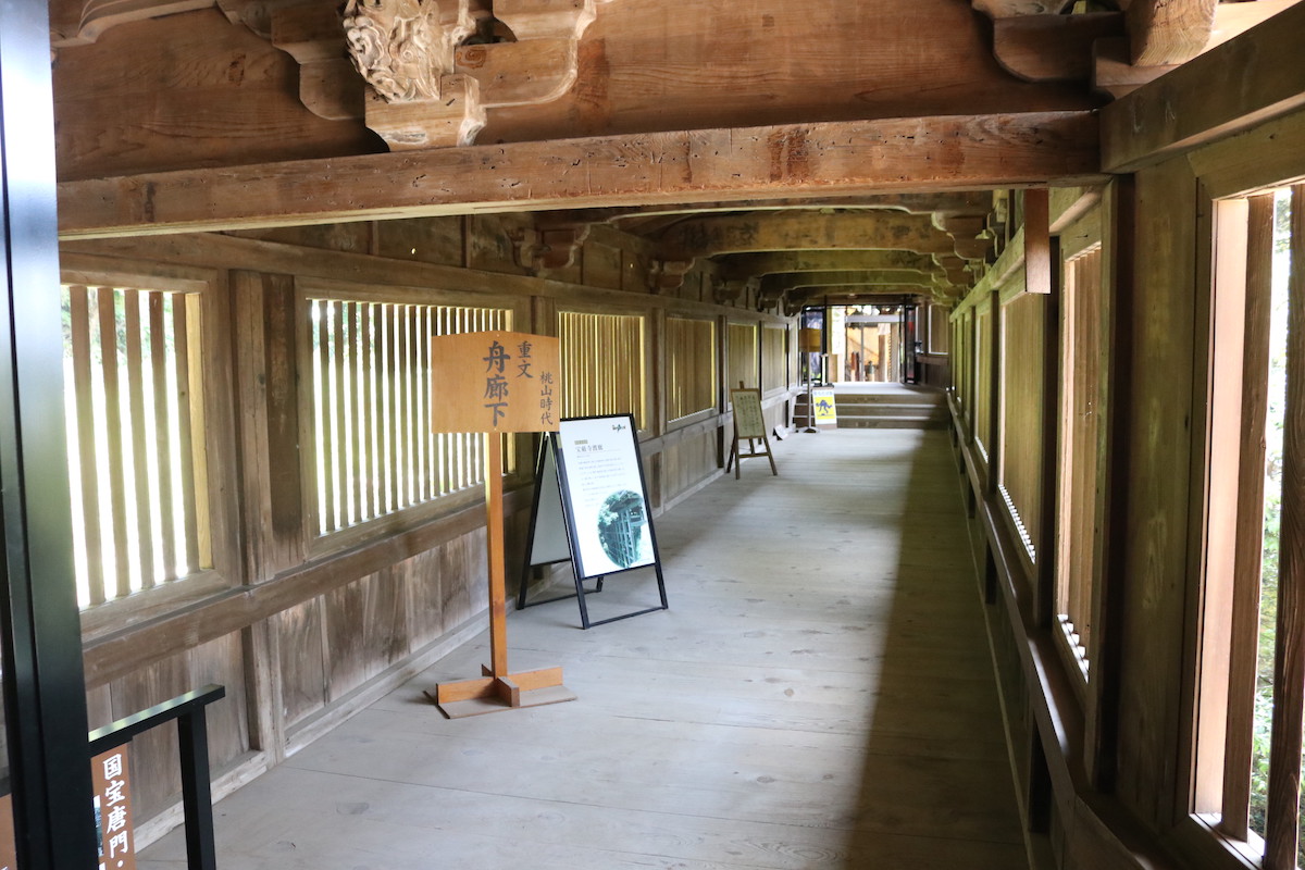 重要文化財「舟廊下」は、朝鮮出兵の際に豊富秀吉が乗ったといわれる御座船「日本丸」の、船櫓を利用して作られています。木でしっかりと組み上げられた廊下は、なんとも質実剛健な佇まいです。
