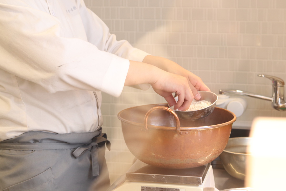 熱伝導の良い銅製のお鍋でしっかり練ることが食感を際立たせるポイント。抜群の粘度になるまで丹念に練り上げ、ようやくひと皿が完成します。
