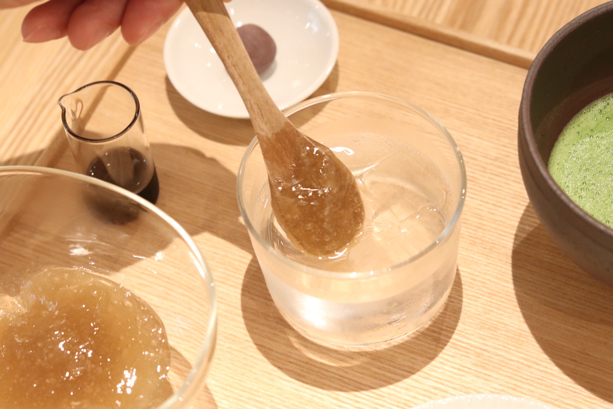 水飴のようにスプーンをくるくる回してわらび餅をまとわせたら、氷水へとぽん。キュッと引き締まった表面と、ほのあたたかい内側のコントラストがなんともたまりません。もちもちとした食感、わらび粉らしい力強く上品な風味、和三盆糖のさらりとした甘み、そのすべてが口の中で一体となり、最後には涼やかな余韻がふわりと広がります。