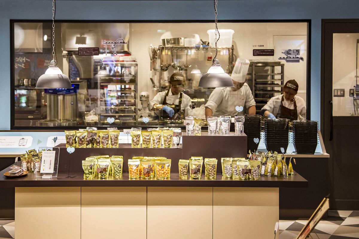 入口右手のファクトリーはまさにチョコレート工場。ガラス張りの窓からシェフやスタッフがチョコレートを作っている様子を見学!甘~い香りが漂ってきます。
