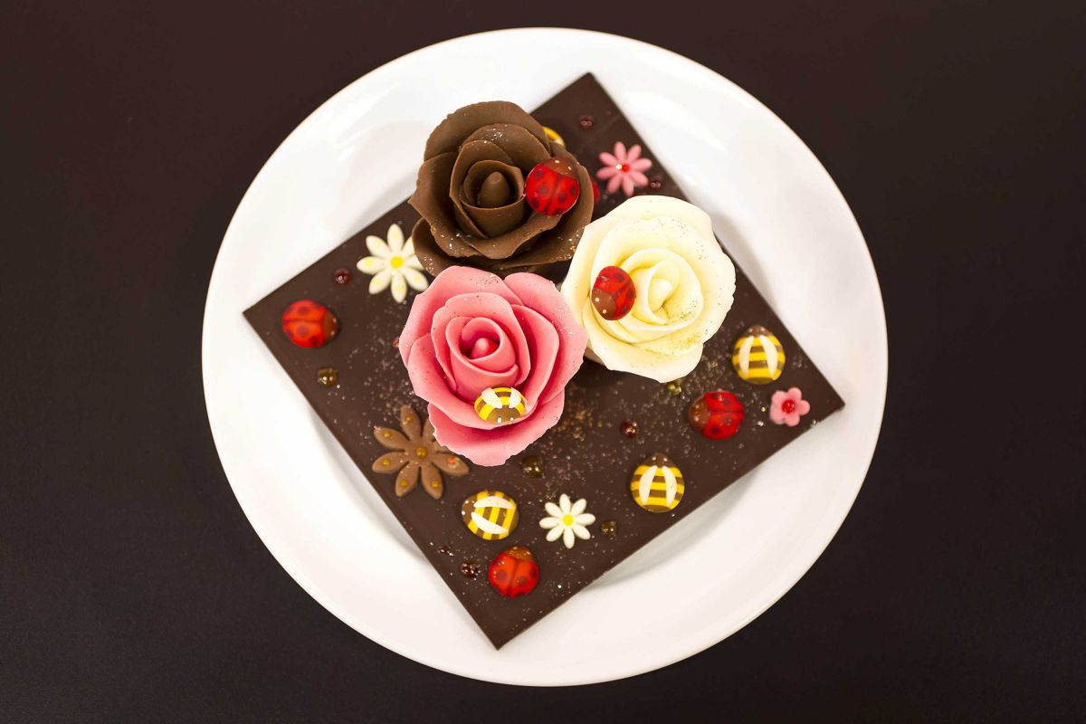チョコレート生地を延ばして、形成して、デコレーションし、約1時間30分で3色のバラの花が完成!クリアボックス入りで持ち帰れて、室温でも溶けないチョコレートなので飾って楽しめます。(公式HPから要予約)