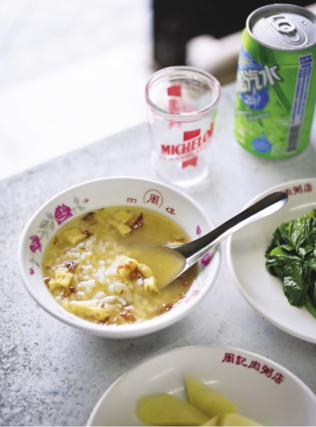 1956年の創業当時から変わらない味を守る老舗「周記肉粥店」。店名にもなっている看板メニューの肉粥(メニュー名は「鹹粥」)はなんとNT$15で楽しめて、豚骨からとった出汁と醤油のあっさり味が朝ごはんにぴったりなんです。