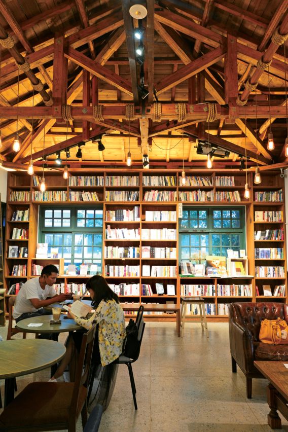 タバコ工場で働く人のために造られた託児所をブックカフェにした「閲樂書店」。昭和レトロな瓦屋根の建物は、壁一面アートやカルチャーの書籍がぎっしり!本を片手にカフェタイムを過ごしましょう。晴れた日は、テラス席での~んびりもおすすめです。