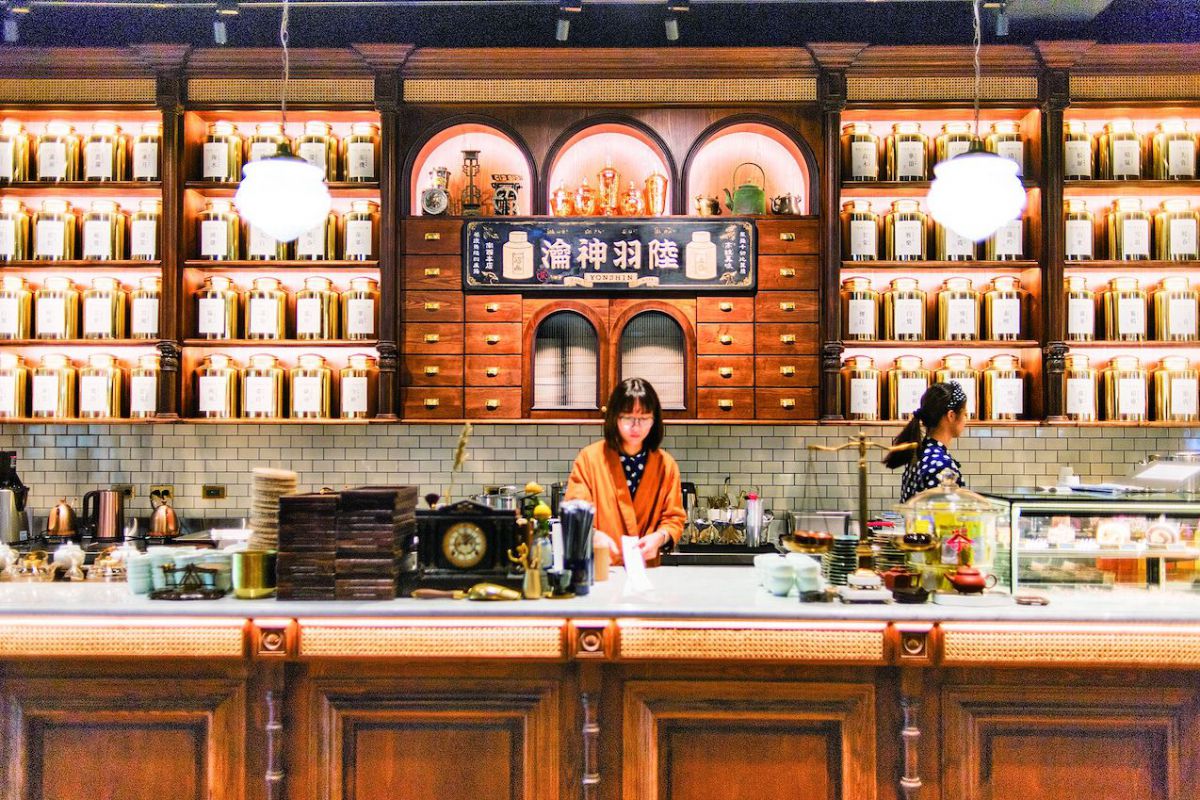 漢方薬局の棚脇に、中国茶がズラリと並ぶフォトジェニックな茶藝館「永心鳳茶」。凍頂烏龍茶や東方美人茶など14種類のお茶が揃い、台湾創作料理や茶葉入りのデザートもいただけます。レトロモダンな中華風のカウンターが素敵すぎ!