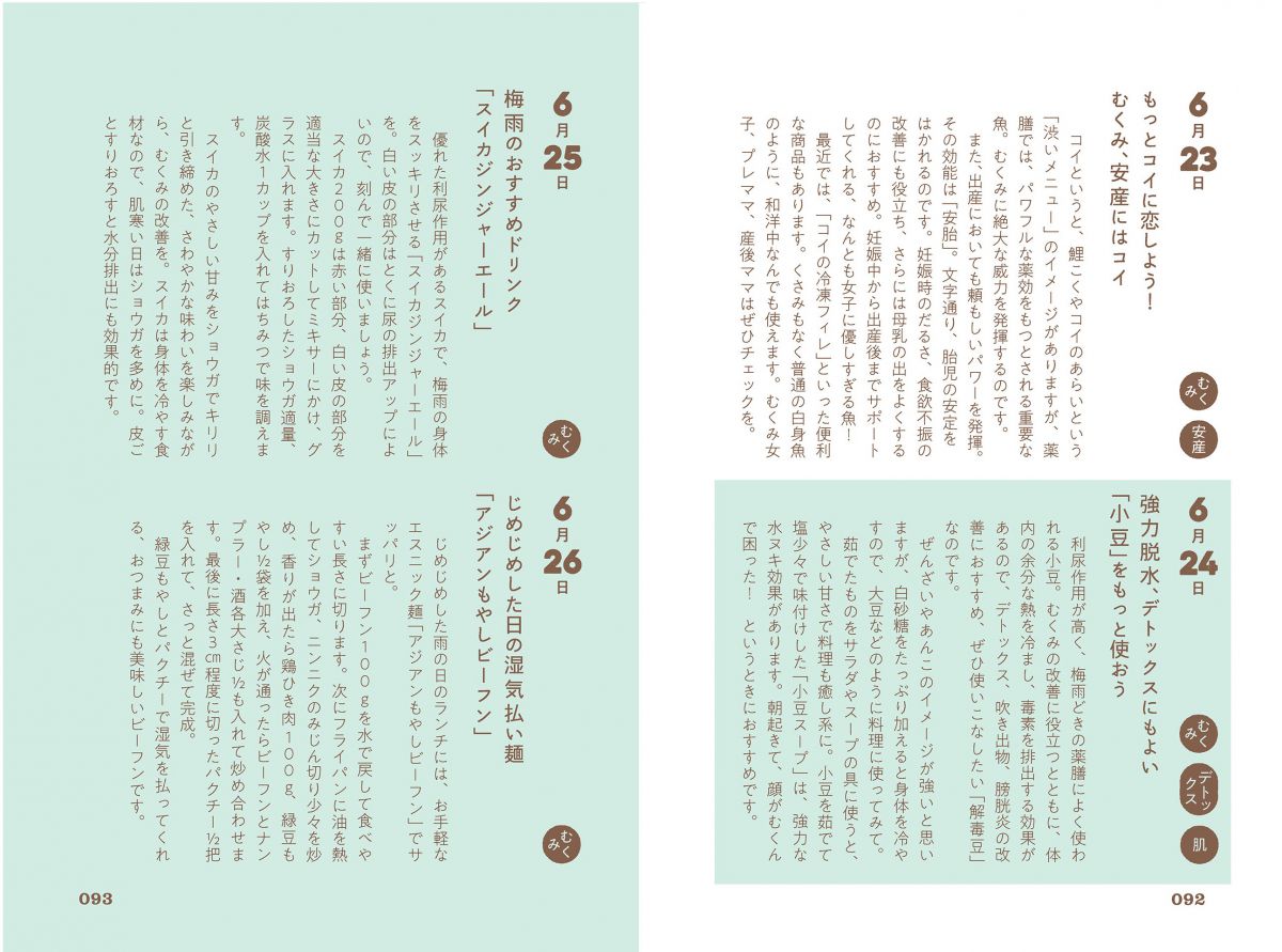 梅雨どきのトラブルを乗り越えるためには、身体の中から脾を強めて、湿気を取り除く食材を取り入れることがポイントです。食べて体内の「除湿」に努めましょう。