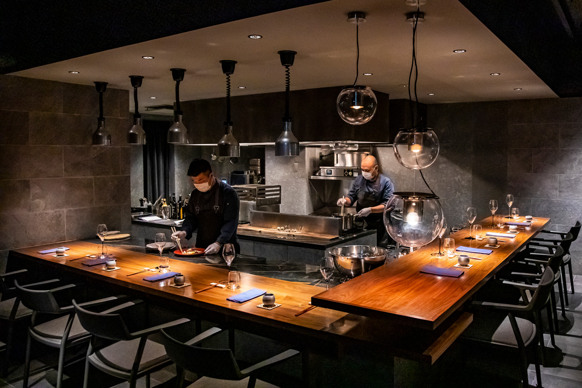 店内はL字カウンターの8席。厨房が見渡せて、調理の香りも音もリアルに届いてきます。スタッフはマスク・手袋着用、要望があればカウンターと調理台との間にアクリル板も置いてもらえるから、コロナ対策もばっちり。入口とお手洗いにはアルコール消毒液を用意し、入店時には検温も実施しています。