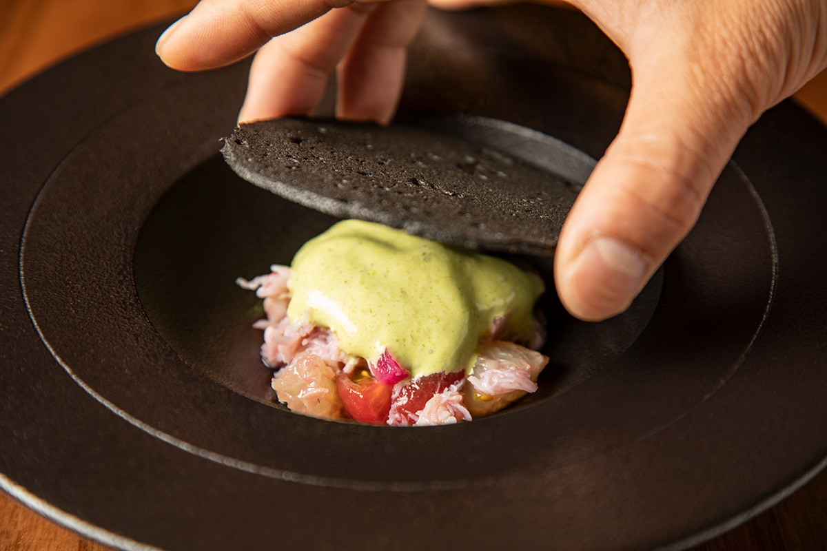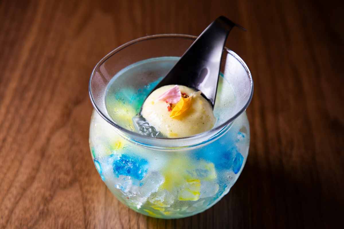 コースは見た目も華やかな食前酒からスタート。レンゲの下には麺のようにつるりとしたのど越しの白桃のリキュール、上にはマンゴーのウォッカの泡がふわりとかかっています。食前酒の認識をくつがえす、“食べるカクテル”のような味わいにびっくり。