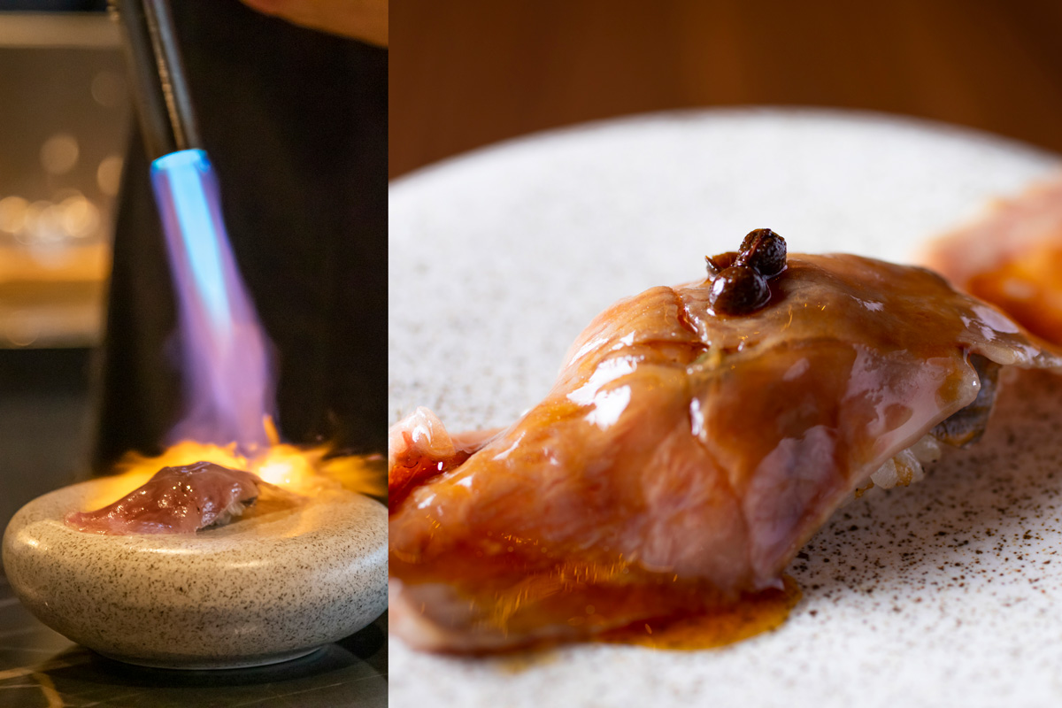 次は黒毛和牛の肉寿司が登場。ガスバーナーで炙ると、上質な脂が溶け出します。ウナギをまぶしたシャリに合わせて、上に有馬山椒をのせ、ピリリとしたアクセントをプラス。
