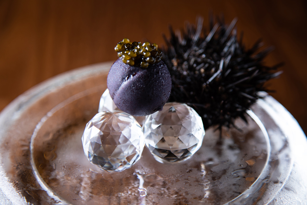 「黒い真珠」はウニのムースとホタテのムース、ヘーゼルナッツが巨峰のような球状に仕立てられていて、上にはキャビアをトッピング。指でつまんで、一口で頬張れば、濃厚な味わいが口に広がります。
