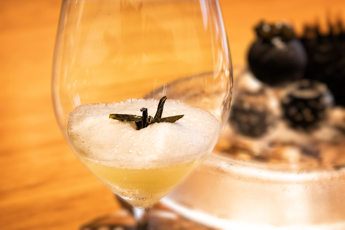 「黒い真珠」に合わせて考案されたペアリングのカクテルは、オリジナリティあふれるソルティドッグ。海産物と相性のいいシソのジンがベースで、青ジソジュースの泡の上には焼きのりで作られた折り鶴がぷかぷかと。見た目も味も驚きに満ちていて、なんとも楽しい!
