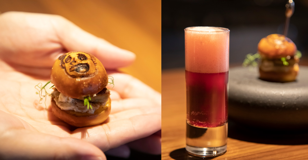 一口サイズで、中里シェフの顔の焼き印もかわいい「SENTIAMOハンバーガー」。かわいらしい見た目とは裏腹に、味は超本格派!フォアグラやクリームチーズと和えたイチジクをサンドし、ソースにはポルト酒を使っています。