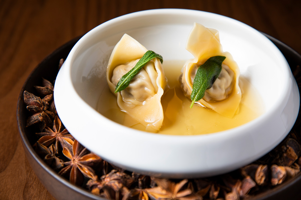 「CASONCELLI DI BERGOMO(カソンチェッリ ディ ベルガモ)」は、イタリアの都市・ベルガモの伝統料理をベースにしたパスタの一皿。ラビオリの中に、合挽肉やサルシッチャ、パルミジャーノチーズが入っているのが定番で、SENTIAMO流のアレンジとして、中国の香辛料・五香粉を加え、コンソメスープをかけています。
