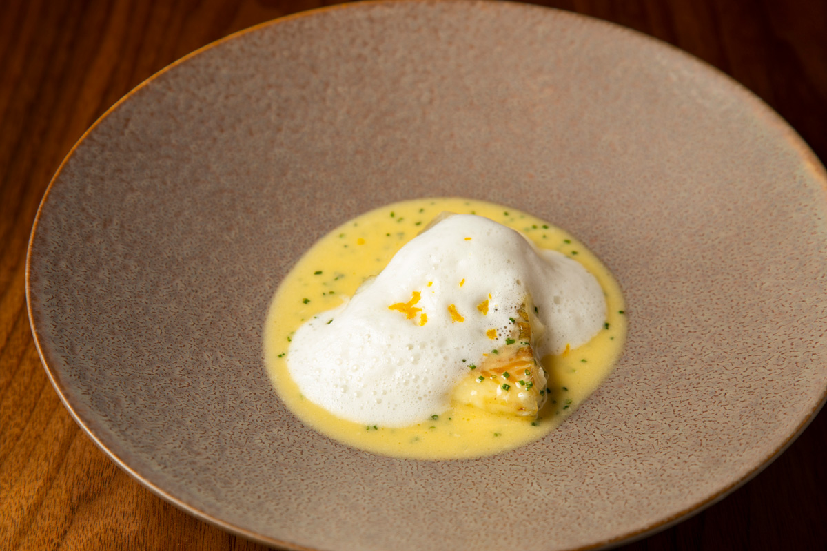 魚料理は白ワインのソースをかけたスズキのソテー。隠し味のハチミツやユズ、付け合わせの冬瓜といった和の食材を使いつつも、フレンチの調理法で仕上げています。