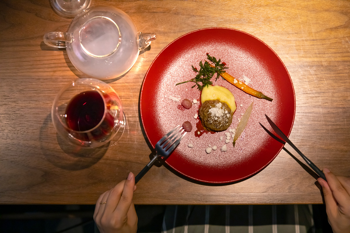 肉料理は黒毛和牛A5ランクのサーロインを包丁でたたいた贅沢なハンバーグ。トリュフの塩や粉末状にしたトリュフオイルが芳醇に香る一皿です。