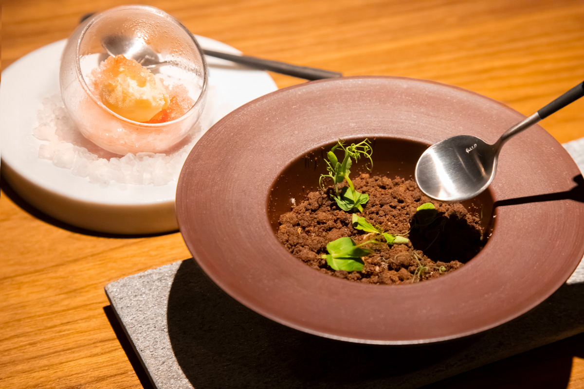 コースを締めくくるデザートは2品。写真奥はスイカのシャーベット&塩アイス、手前は遊び心満点の植木鉢みたいなティラミスです。土のように見えるのは、川越名物の黒糖の麩菓子で、そこにナッツの新芽を添えてレストランの新規開業を表現。川越の地に根を張っていこうというシェフの想いを感じつつ、最後まで美味しく平らげました!