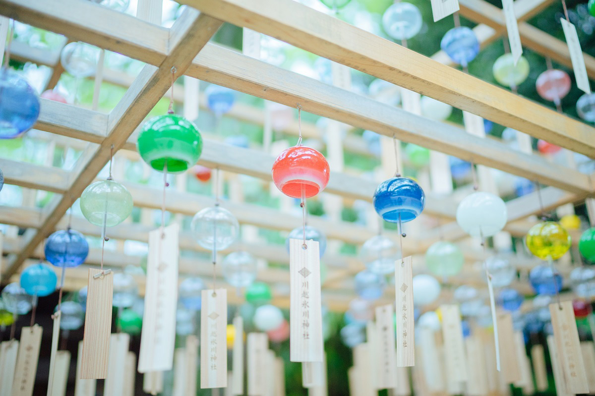 境内には樹齢600年を超えるケヤキの御神木や清らかな小川、絵馬トンネルなど見どころがいっぱい。写真は例年7月から9月初旬にかけて開催される夏の風物詩「縁むすび風鈴」。2000個もの江戸風鈴が飾られる涼やかな祭事で写真映えすると大人気ですが、残念ながら今年は7月の開催が見送りになりました。また次の開催をお楽しみに。※2020年8月以降の開催については、川越氷川神社公式ホームページをご確認ください。