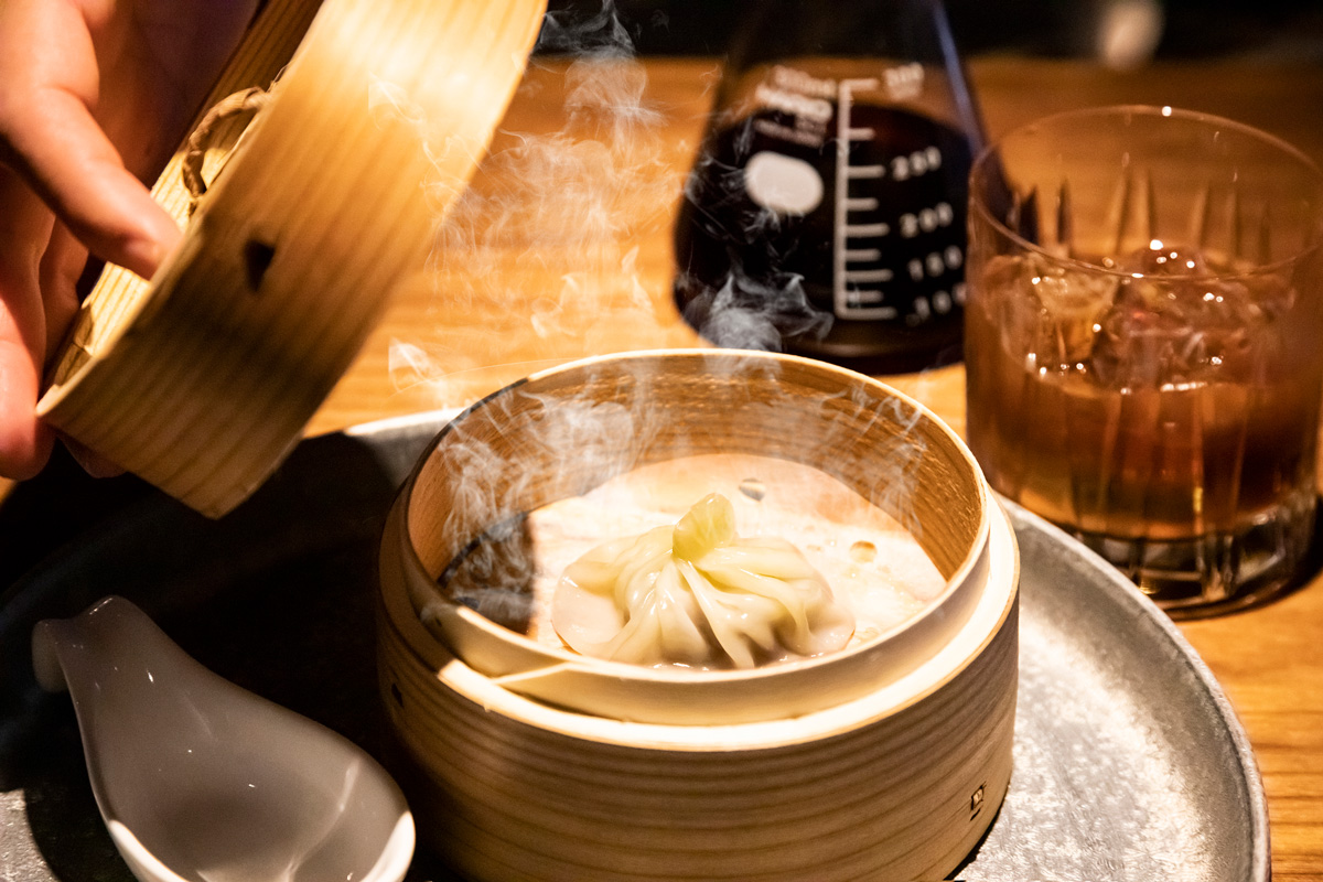蒸籠から立ち上る湯気の中、現れたのは「小籠包」。ラム肉に食感が楽しいクルミを合わせ、中からは肉汁と野菜ダシのスープがあふれ出てきます。