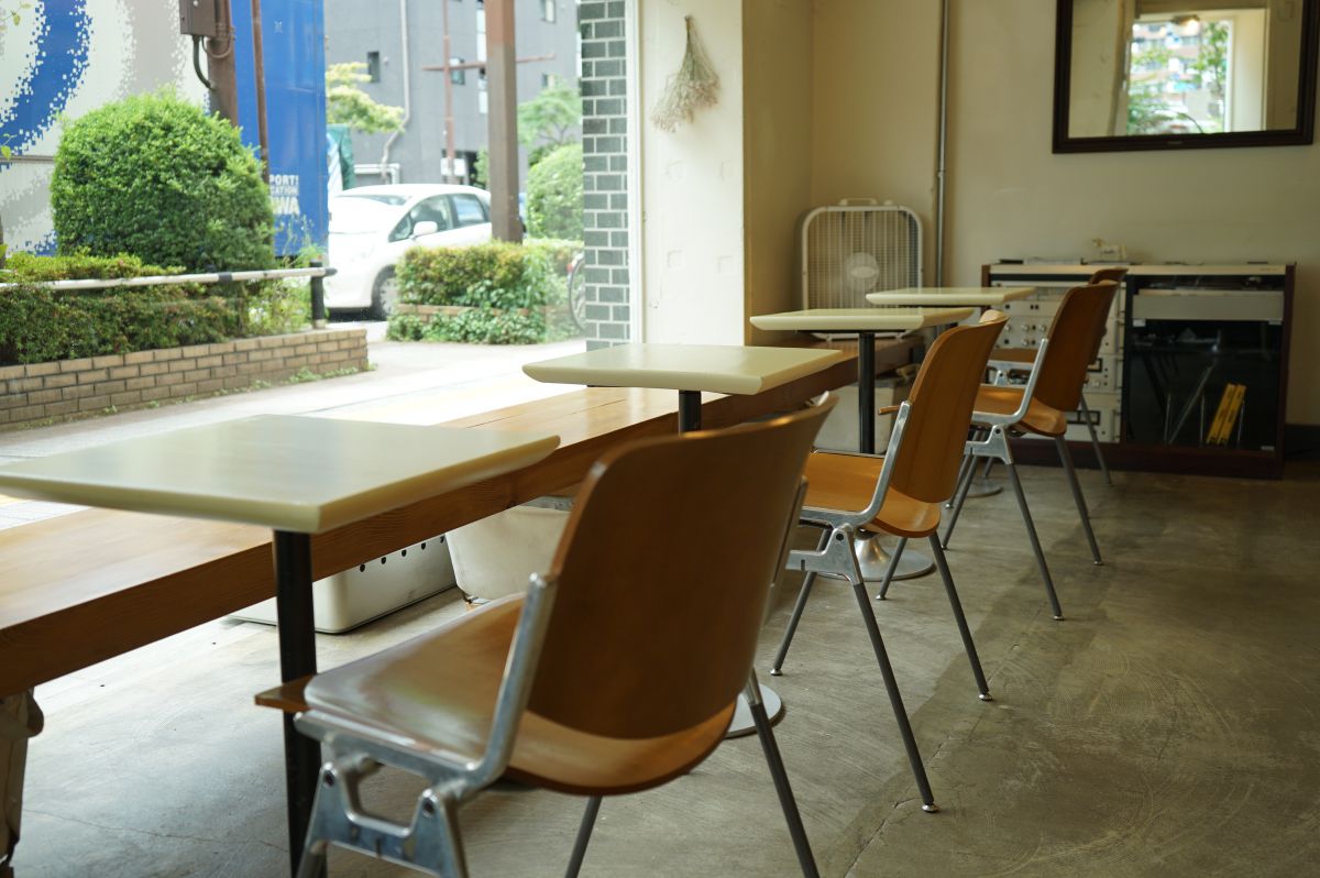 大きな1枚ガラスの窓から明るく陽が差し込む店内や、店を囲うように並べられたひと続きの木のベンチにお客さんが腰掛け、コーヒーを片手にのんびりと過ごしてる姿は、まるで公園で見かける風景そのもの。