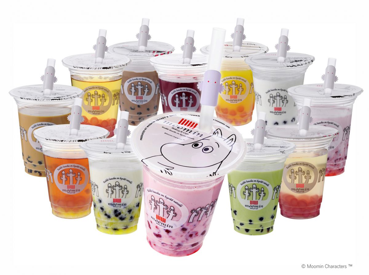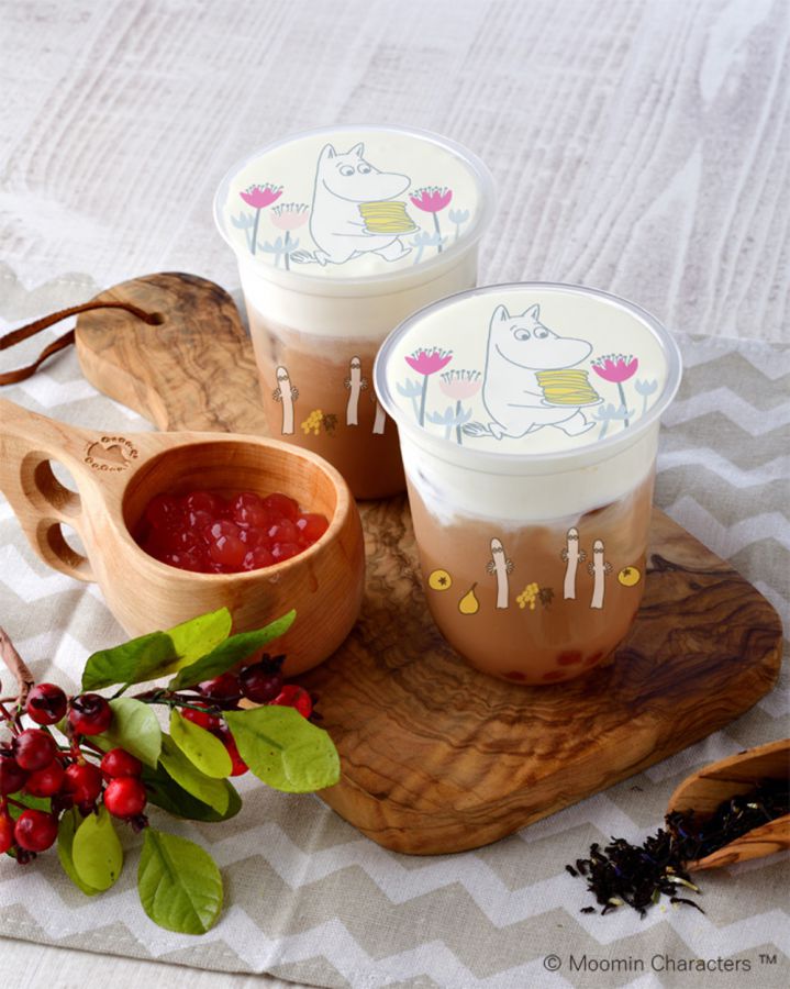 ムーミンがパンケーキを運んでいるイラストが描かれたカワイイ「紅茶ロイヤルミルクティーラテ~ブルーベリーパンケーキFlavor~」650円。「ニョロニョロの種(ベリー)入り」は750円です。
