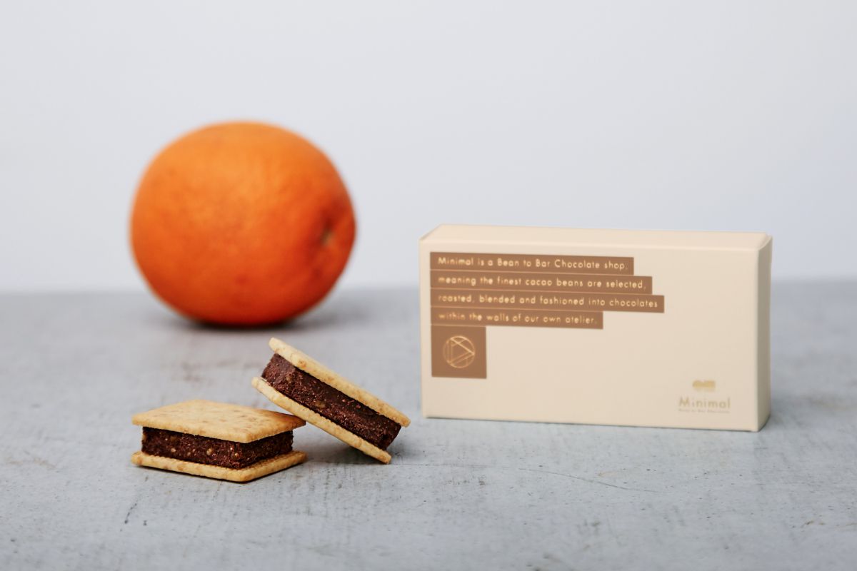コロンビア・トゥマコ産カカオの香ばしいナッツや、カラメルのような香りのチョコレートに爽やかなオレンジを練り込んだ「チョコレートサンドクッキー -オレンジタルト-」。
