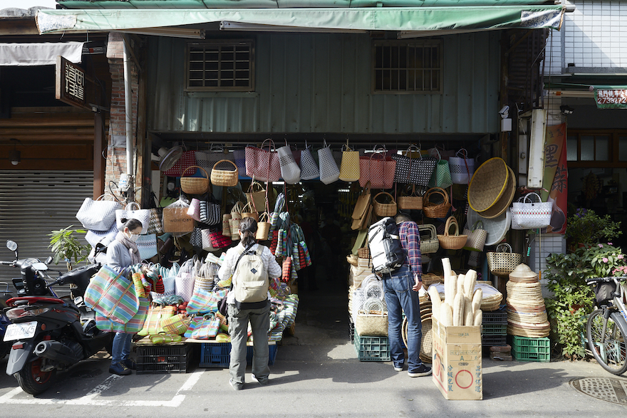 「高建桶店」には竹製の籠やバッグ、キッチングッズがズラリと並んでいます。台湾製の籠やプラバッグが人気ですが、お手頃価格の東南アジア製の商品もおすすめです。