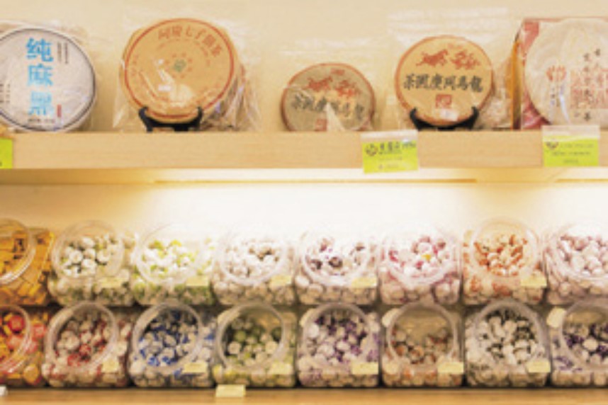 バラエティ豊かな乾物を扱う「新點子門市部」では、ドライフルーツやドライ野菜はなんとどれでも試食OK!お茶も多数扱っており、おみやげにもぴったりです。素敵なディスプレイやおしゃれなパッケージも人気の理由とか。
